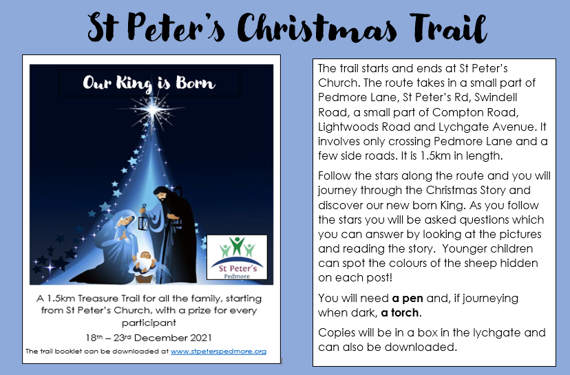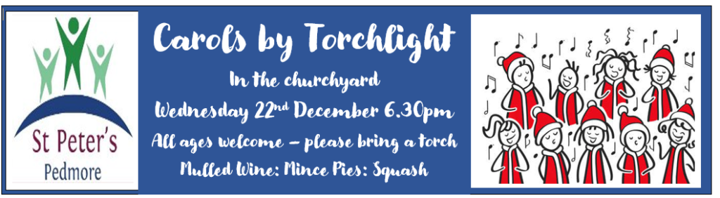 18th – 23rd December. 1.5 km treasure trail for all the family, starting from St Peter’s Church, with a prize for every participant. The trail booklet can be downloaded from www.stpeterspedmore.org.